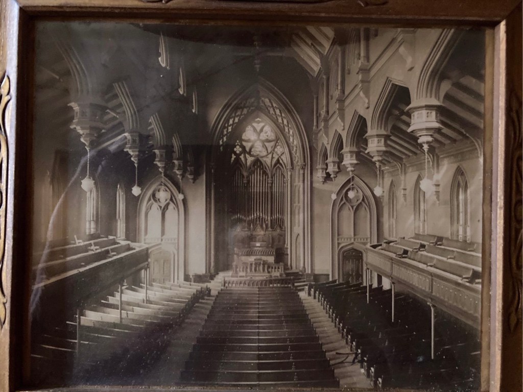 We believe this is a picture that Davidson took of the interior of the Union Congregational Church in Providence RI. Unfortunately, the signed, untitled photo is glued to a piece of cardboard so I cannot access the back of the photo, which could give me some information or an index number. Our assumption is that this is not a copyrighted photo and most likely one of a kind.