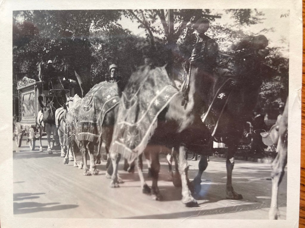 David Davidsons camera captured troop training, battle simulations, and parades. But at some point in time, Ringling Brothers Barnum and Bailey Circus must have paraded through the streets and Davidson was there to capture the event. In the photo of the white horses pulling a carriage, you can see a banner displaying the words “The Greatest Show on Earth”.