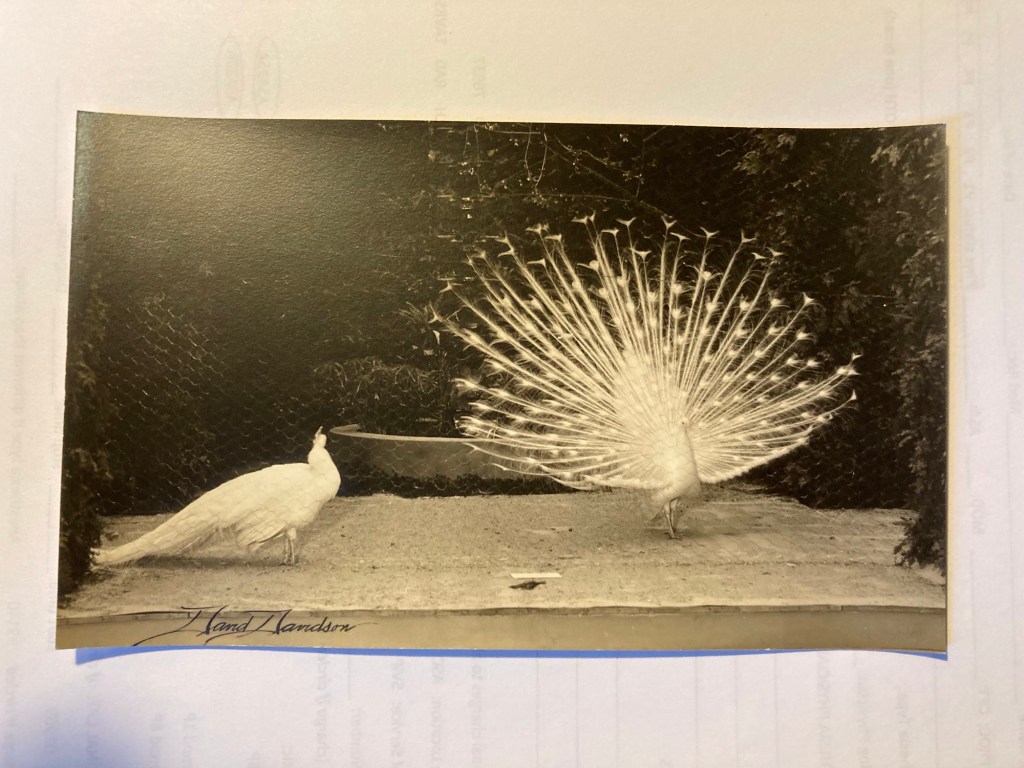 “Sitting Pretty” was the title, and it was done in sepia tone. Later that day and that night at dinner the conversation over the picture continued. Where did Davidson take that picture? A zoo? The zoo at Roger Williams park? Which made sense considering the parks connection to Davidson. It was brought up that it just might have been someone who had a Peacock in a pen in their back yard. Was the answer that uninteresting? It wasn’t. But it was years before I had the answer.