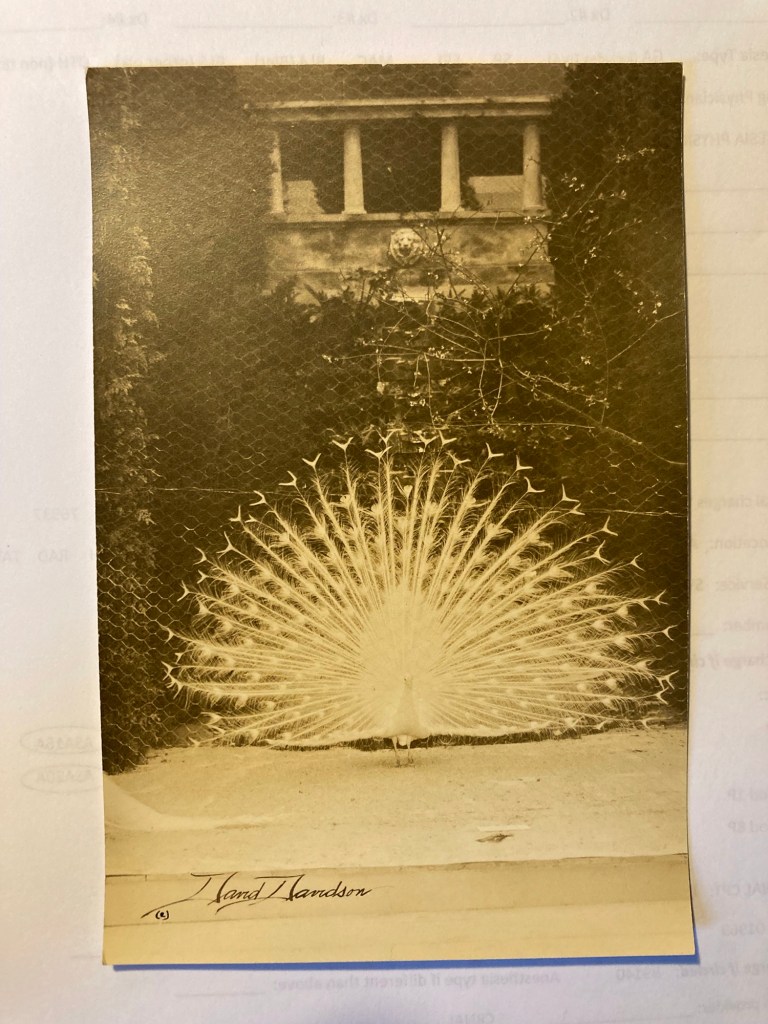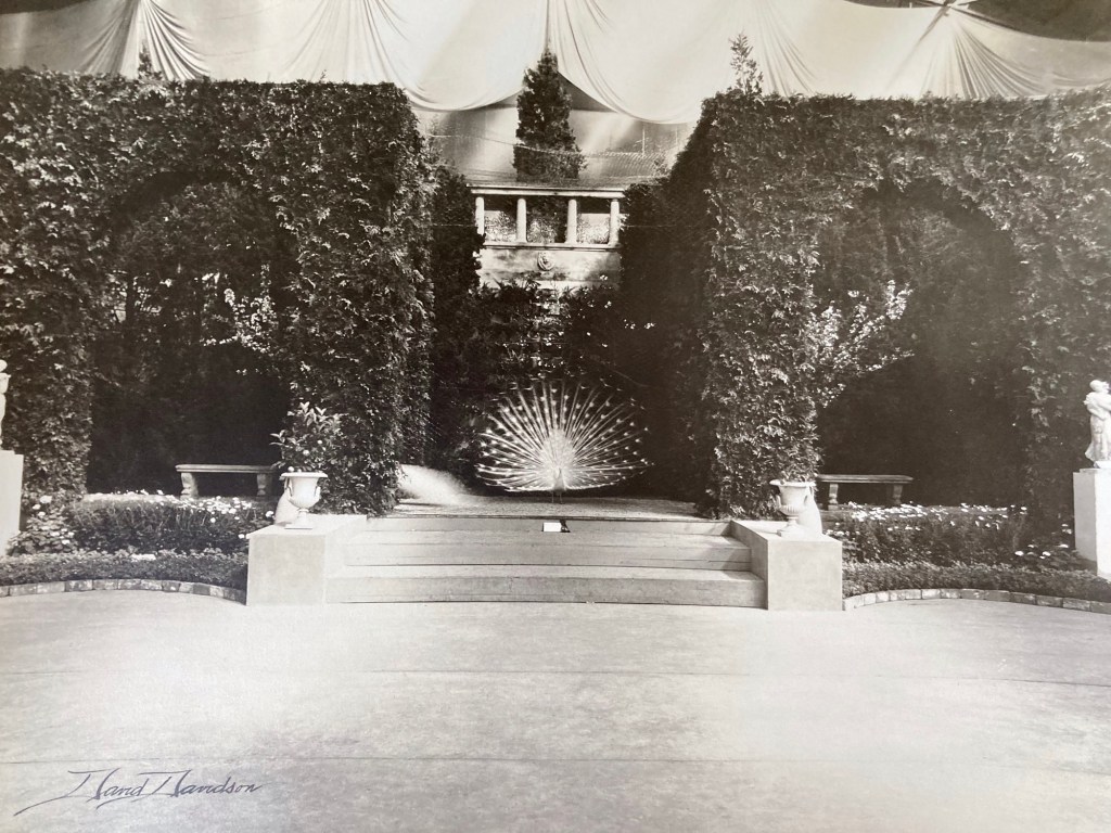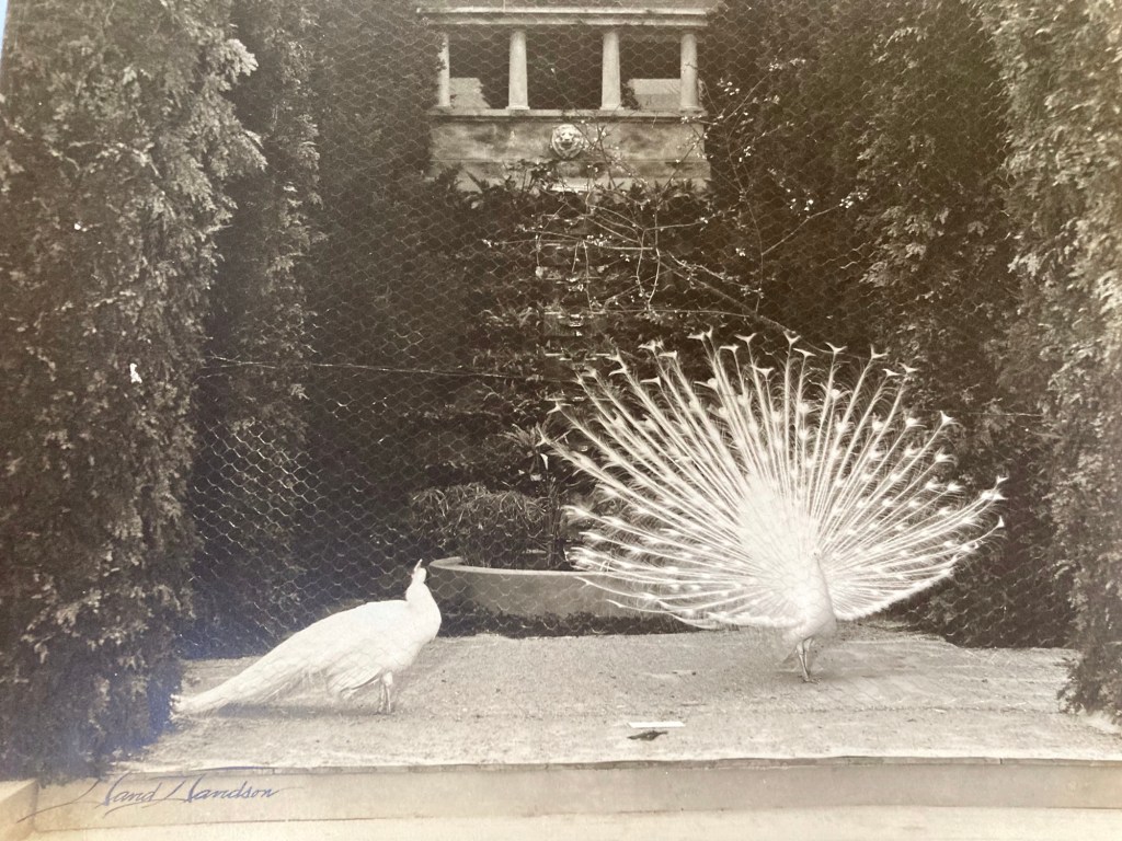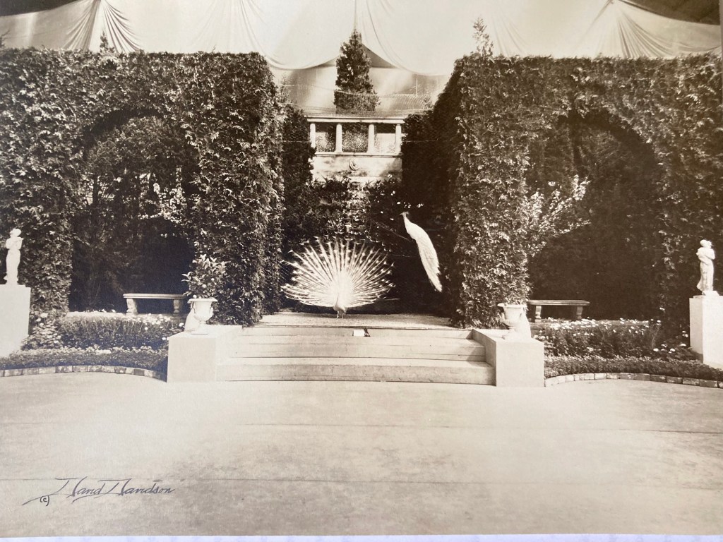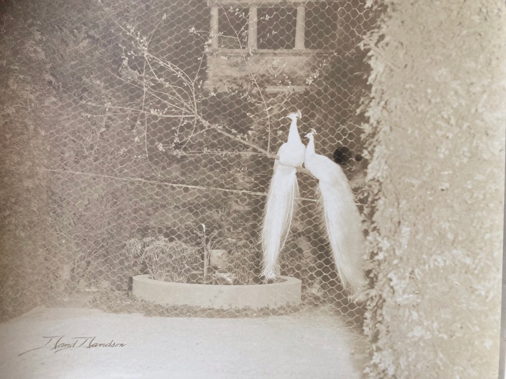 It was 2012 when I was fortunate enough to have purchased a box of pictures that Davidson took at “The Flower Shows”??? I knew nothing about flower shower pictures! In amongst all these fabulous colored garden scenes were pictures of Peacocks. Evidently one of the horticulturists participating in an annual flower show had brought along two Peacocks to enhance their display.