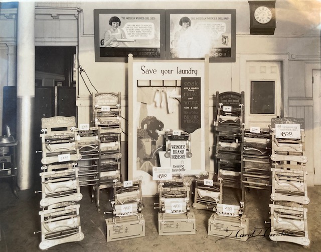 This is a simple advertising photo Davidson took for Wringer Brand Horseshoe Clothes Wringer Co. (can you imagine that this was once state of the art clothes drying?)