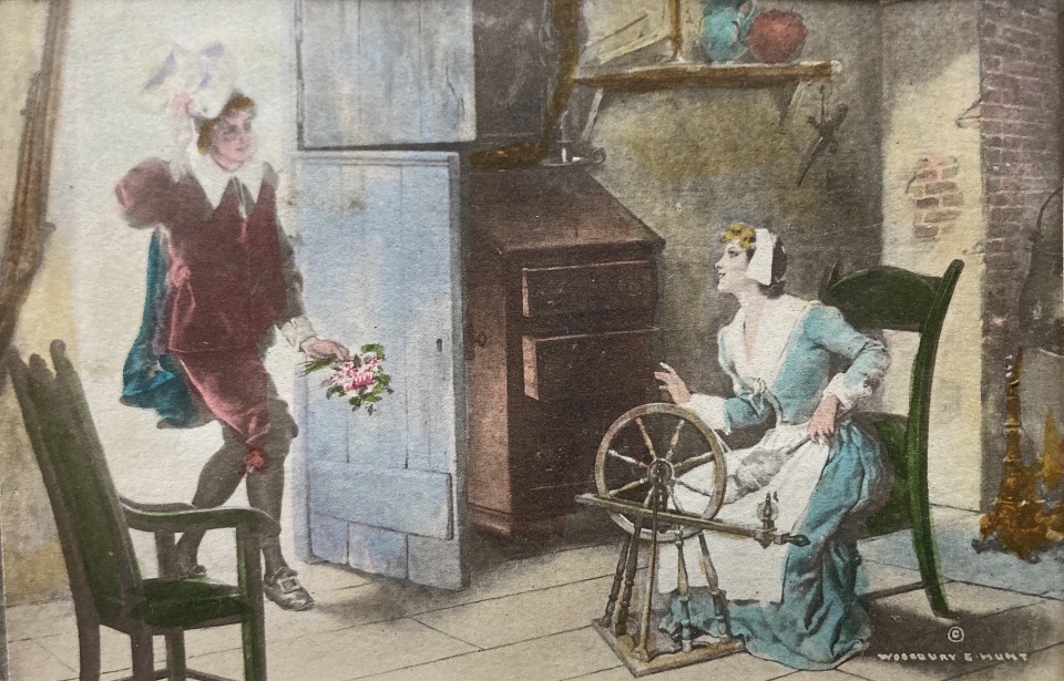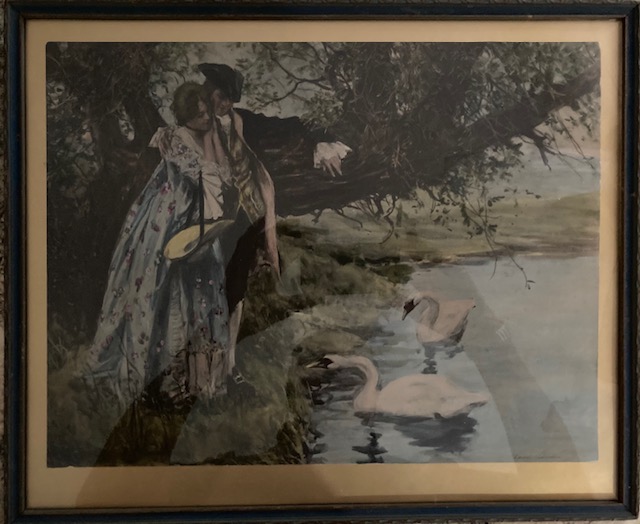 These images are John Alden and Priscilla. They were also titled “The Mayflower of Plymouth”, the untitled “Couple and Swans” and “Return of the Victors”. These are black and white photos of paintings that were then hand colored. Soon my search for these different Davidsons had me finding this picture, which was done in the same way but not colonial in appearance.