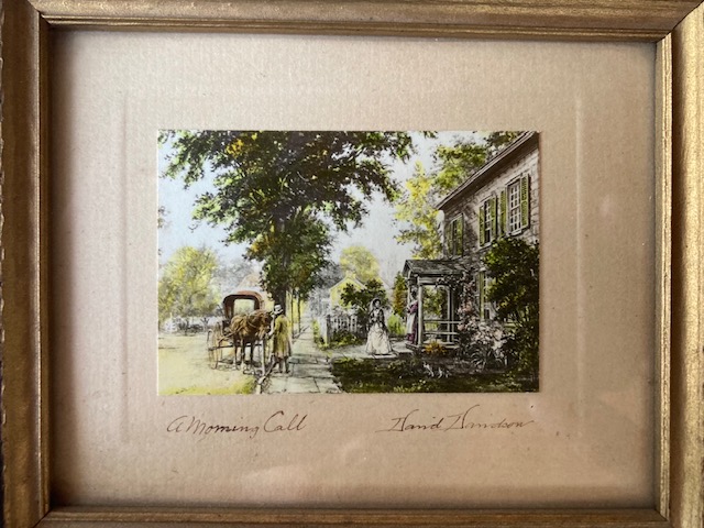 This is an image of “A Morning Call”, which was a black and white photo of a colonial drawing. Davidson colorists turned it into a hand colored photo