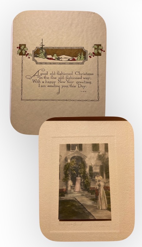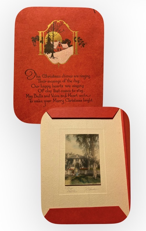 David Davidson Studios has a line of greeting cards. Creating these cards required all of the talents of everyone in the small family business. From the photography, and hand coloring, to the design work. Maybe most important of all was the poetic ability of Davidson’s wife Louise to create the appropriate poem to tie it all together. The most popular of these greeting cards were those to celebrate Christmas. These 2 page greeting cards came with a mini hand colored photo, mounted to a 5″ x 7″ mat.